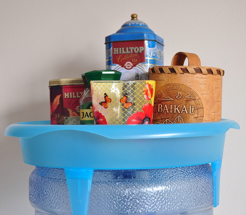 Поднос-полка с фиксаторами, надежно удерживающийся на донышке бутыли, установленной на кулер. Компактный, аккуратный, воздушный, в базовом светло-голубом цвете — идеально подходящий для бутылей с водой как поликарбонатных, так и изготовленных из ПЭТ